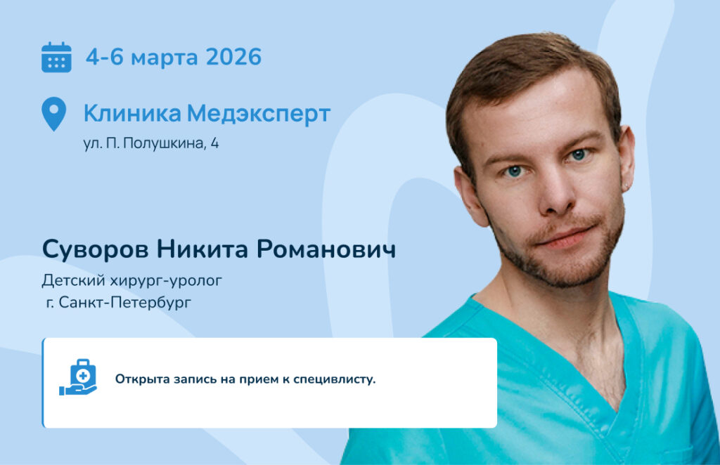 4-6 марта 2026 г. в филиале «Ритм», ул. П. Полушкина, 4, будет вести прием детский хирург-уролог из Санкт-Петербурга — Суворов Никита Романович.